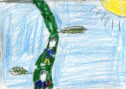 So they grabbed the hen and ran back to the beanstalk. They climbed down. When they got to the bottom of the beanstalk, they rushed to the sheep. Andy said,